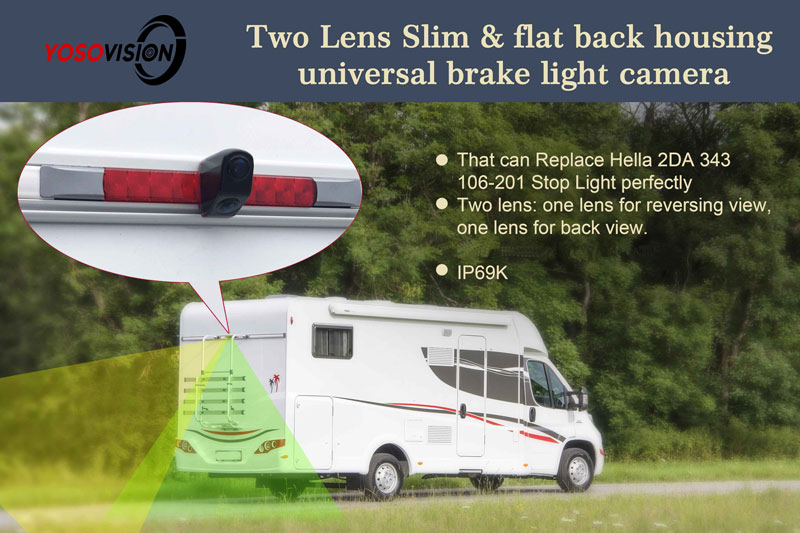 Dual lens rear view camera 3rd Brake light Universal Rear view camera specially designed for use on transporters or motorhomes Simple replacement with the factory-set 3rd brake light glass Hella 2DA 344 106-201 dual lens camera modules with 90° or 170° for close/distance range Fixed vertical coverage angle for optimum viewing angle Can be used with all monitors that have a RCA video input High-quality workmanship & visually appealing design